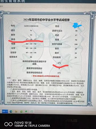 启启中考成绩达到672分考上星耀云大附中