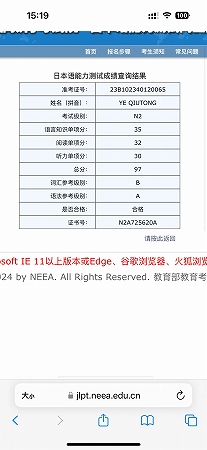 叶秋彤通过日本语能力考试N2